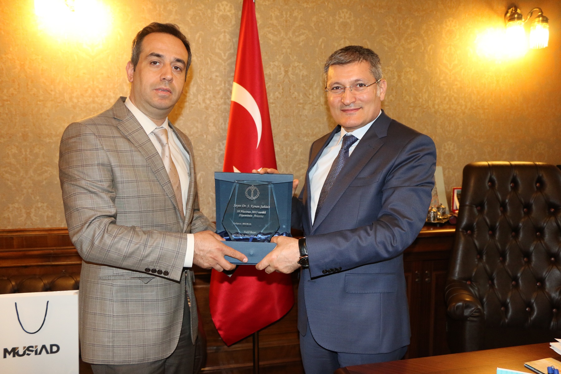 Az eseményen résztvevő Fadıl Başar (MUSIAD) és az Európai Török Demokraták elnöke Mehmet İnceoğlu emléktárgyat adott át Dr Salih Kenan Sahinnak., pendik polgármesterének.