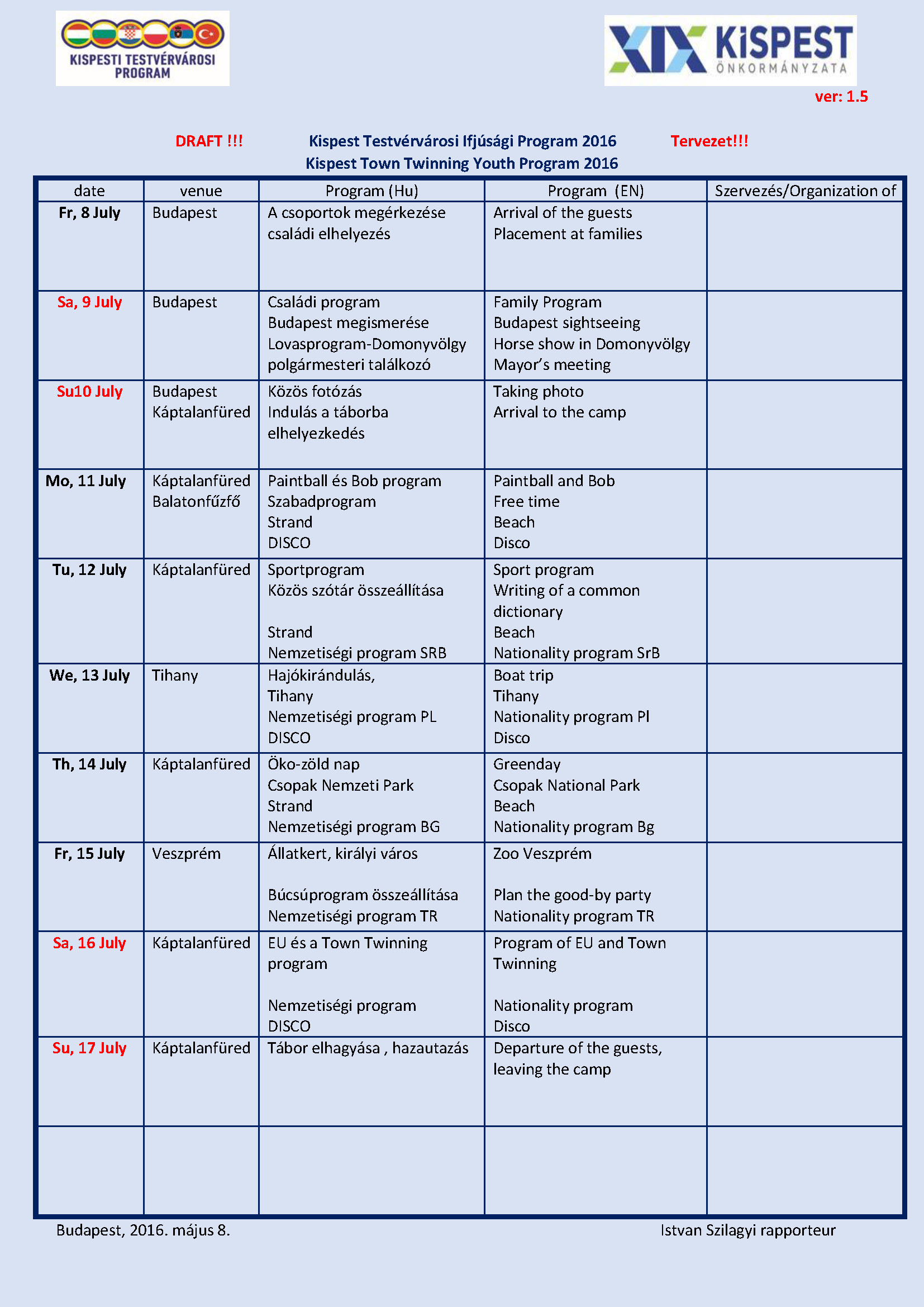 tervezett időpont: 2016. Július 08-17